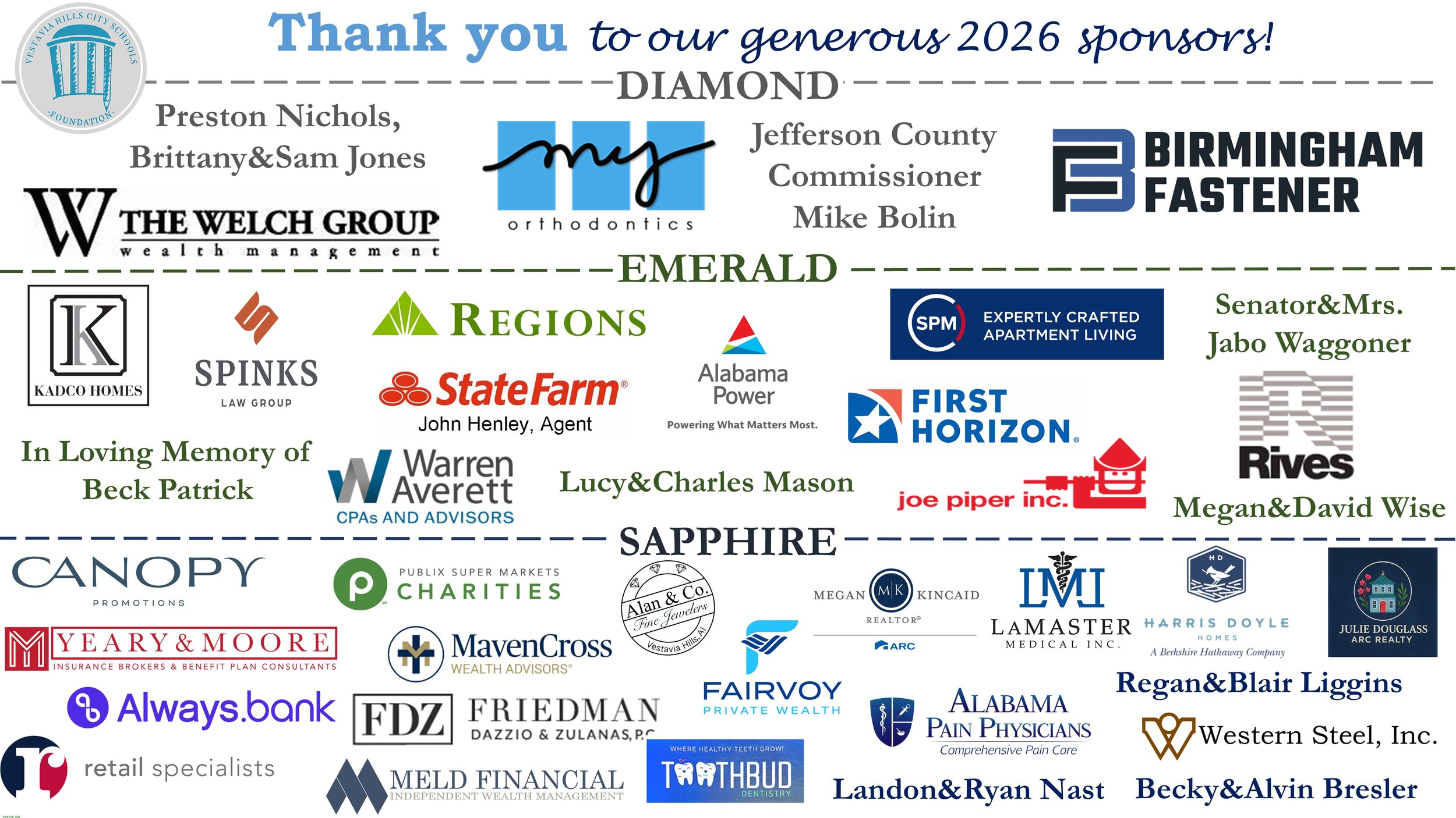 Join us for our 20th annual Dinner and Diamonds, benefitting the Vestavia Hills City Schools Foundation. This event will be held Saturday, February 28, 2026, at the Vestavia City Center. We are so grateful for your support!